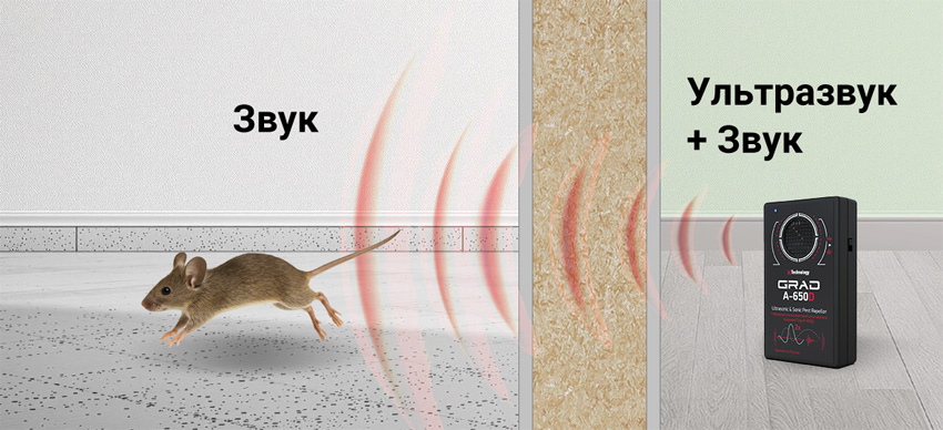 Прибор в работающем состоянии является источников мощных ультразвуковых и/или звуковых волн (в зависимости от выбранного режима работы), которые сильно воздействуют на нервные окончания грызунов, обладающих обостренным слухом, и вызывают у них чувство паники. Отпугивающий сигнал инстинктивно воспринимается мышами и крысами, как источник повышенной опасности, поэтому они стараются отбежать от него подальше и не приближаться.
