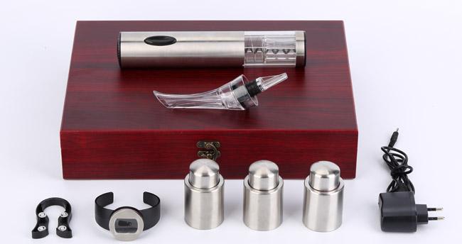 Подарочный винный набор в стильном кейсе из дерева. Включает 7 полезных инструментов: электрический штопор, работающий от собственного перезаряжаемого аккумулятора, аэратор для насыщения вина кислородом, три вакуумные пробки из стали, сохраняющие вино в откупоренных бутылках свежим, нож для быстрого срезания фольги с горлышка бутылки и цифровой термометр, измеряющий температуру вина в закрытой/открытой емкости с точностью до 1°C в широком диапазоне (от -9°C до +70°C). Стоимость подарочного набора гораздо ниже, чем общая цена всех перечисленных инструментов при их покупке по отдельности.