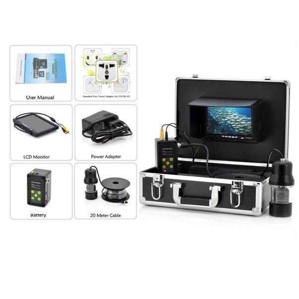 Подводная камера для рыбалки Нептун 360+DVR топовая модель в нашем модельном ряде. Из всех видеоудочек и камер для рыбалки отличительной её особенностью является наличие механизма для вращения камеры на 360 градусов. Сама камера находится в герметичном корпусе, напоминающим стеклянную колбу. Управление происходит с помощью проводного дистанционного управления. Вращение может быть автоматическим, так и ручным. Чтобы оглядеться под водой нужно всего лишь нажать кнопку "влево" или "право". В случае хорошей подводной освещенности можно отключить светодиодную подсветку подводной камеры с помощью ПДУ. Это поможет сэкономить заряд аккумулятора и меньше привлекать внимания подводных обитателей глубин. Весь комплект поставляется в защищенном алюминиевом кейсе, что несомненного облегчит подготовку к началу использования видеоудочки. Семидюймовый дисплей встроен в крышку кейса и не нуждается в дополнительных подставках и креплениях, а так же имеет солнцезащитный козырек.